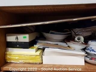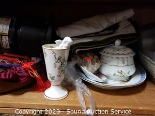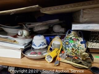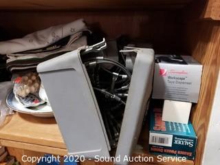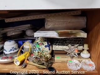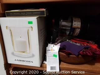 Lot Details: Bali vinyl blinds, tape dispenser, china, lantern, Ambrosia candle lamp, note pads, candle holders, camera bags, tire chains, twin sheet set, neck pillow, hole punch and much more.