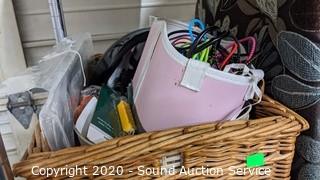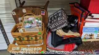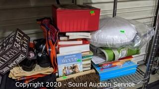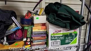 Lot Details: Child's wood chair, various books, hat boxes, Wii balance board, CD's, wicker basket, flashlight, breathalyzer, chair pads, lanyards, helmet, hula hoop & much more. Cart NOT included.