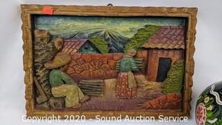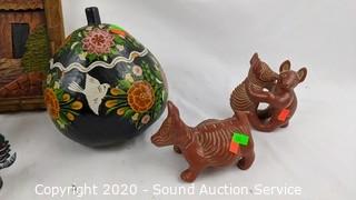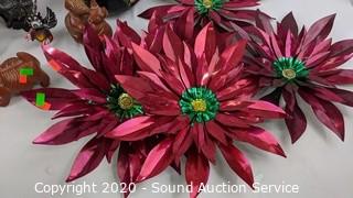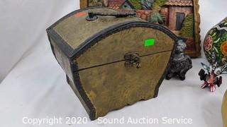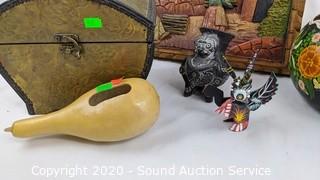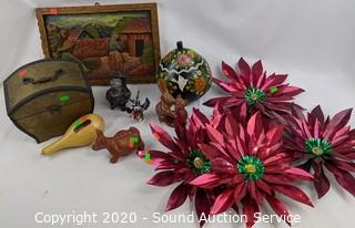 Lot Details: Includes (5) 13" metal art flower wall decor, pottery animal figures, painted gourd, pottery character pitcher, hand carved wood plaque artwork and embossed brass wrapped chest. Artwork is 15" x 10", chest is 7" x 9" x 6".