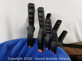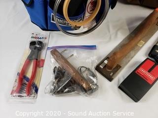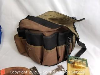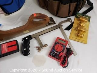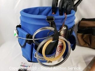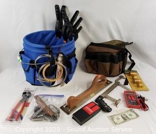 Lot Details: Includes Bucketeer 44 and other bucket tool bag, 3 clamps, multi meter, stud finder, tile cutting tool, garden hose quick coupler set and misc hardware.