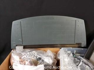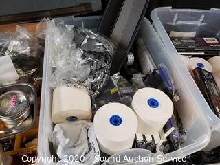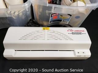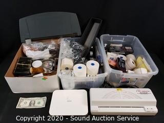Lot Details: Laminator, receipt rolls, router, paper cutter, printer ink, screws, tacks, hooks & more.