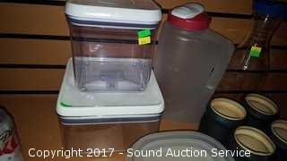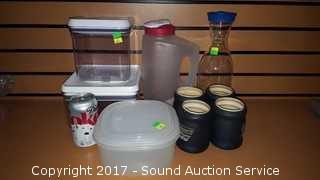Lot #0141: Plastic Containers, Pitchers & Drink Cozies
