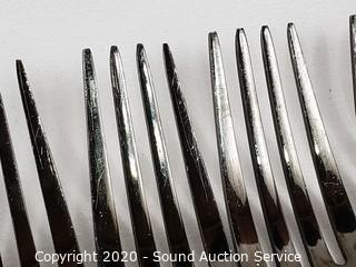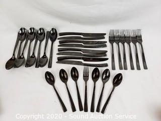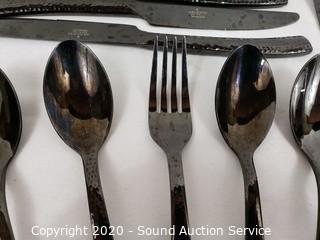 Lot Details: 8 knives, 8 tablespoons, 6 teaspoons, 6 dinner forks, 1 salad fork. Have been used, some scratches.