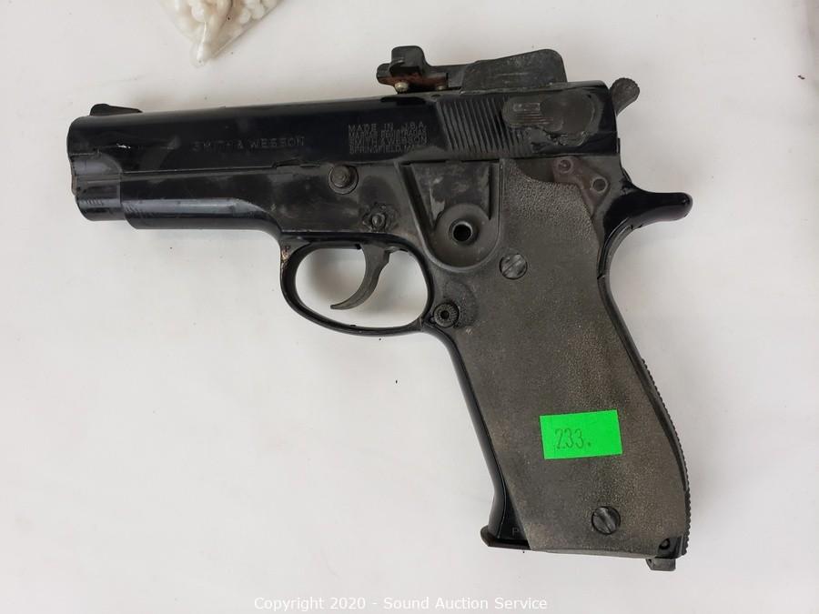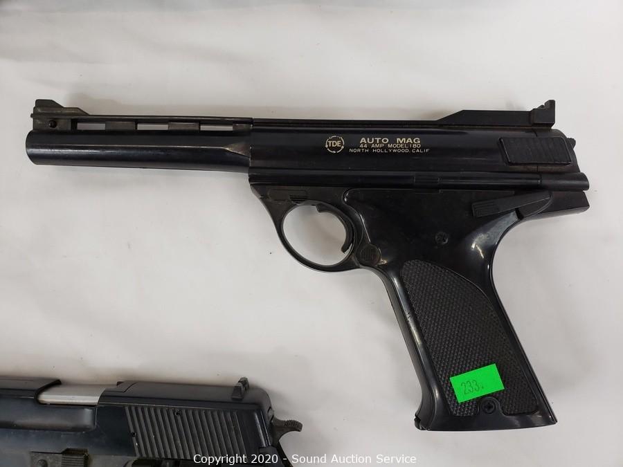 Lot Details: Look like the real thing. Comes with air soft pellets. Unknown if in working condition. Includes a Ingram 9mm .45 A.C.P., A Smith & Weston, Sig Sauer P220, Auto Mag 44 AMP Model 180