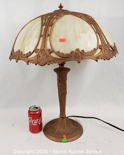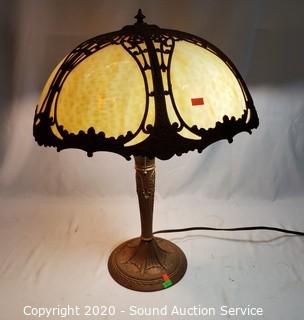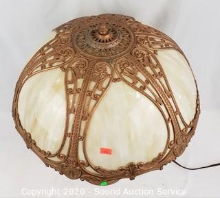 Lot Details: 23" H x 18" diameter glass & ornate metal shade.