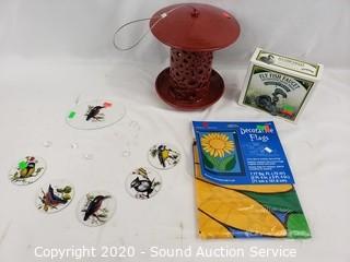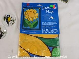 Lot Details: Includes 6pc painted glass window decor (2.75" to 5.5"), sunflower flag is 2ft x 4ft. Also comes with a bird feeder.
