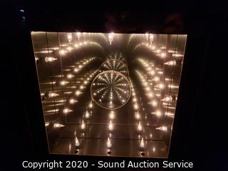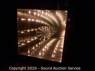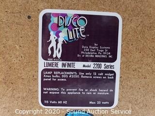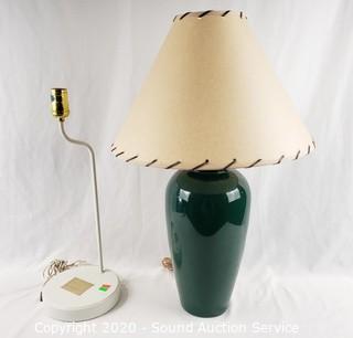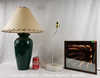 Lot Details: One lamp has no shade. Disco light is 12" x 12" x 3", table lamps are 18" to 25" tall, 16" diameter.