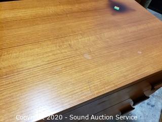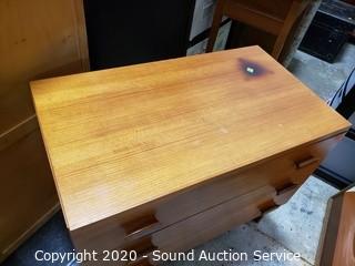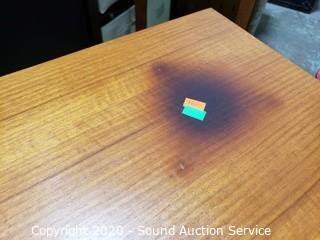 Lot Details: Has a burn spot on the top and a gouge in the top drawer's finish, otherwise in great condition. 28" x 32" x 18".