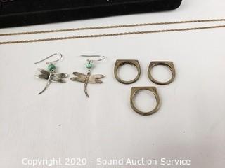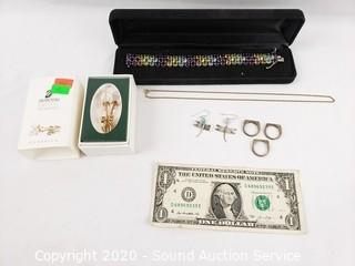 Lot Details: Includes Kingman turquoise and sterling silver earrings, 3 sterling pinky rings, 1/20 12K gold filled chain, sterling and gemstone encrusted 7" bracelet and Swarovski crystal rose pin. TW sterling without bracelet 10.7 grams. Bracelet weighs 33.9 grams. Gold filled chain weights 1.8 grams.