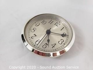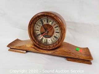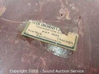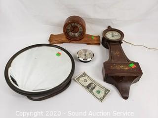 Lot Details: Includes quartz mantle clock (works, some corrosion inside battery housing, 6" x 12" x 2.25"), vintage electrified Seth Thomas wall clock (works, 19" x 6" x 3", various wear to the finish), quartz clock insert and 12" beveled vanity folding mirror.