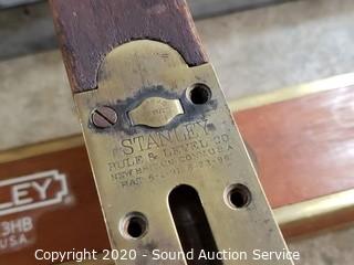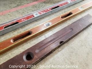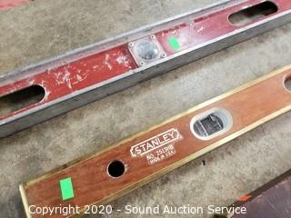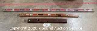 Lot Details: Includes antique Stanley 3ft wood level (last patent date 6/23/96), Stanley #2513HB 4ft level and aluminum MD 6ft level. All bubbles are intact.