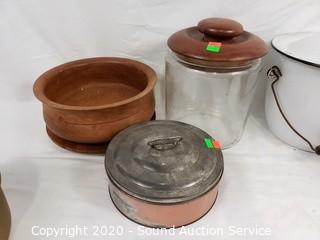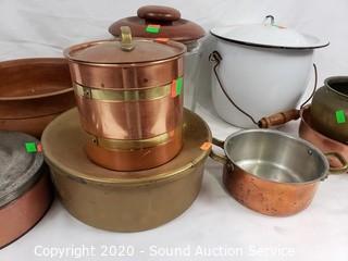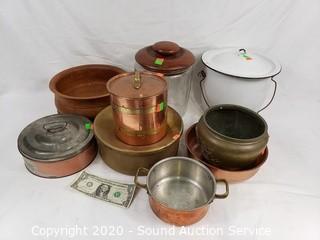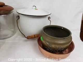 Lot Details: Includes brass bed pan, copper pot, brass planter, copper bowl, enamelware lidded pot and glass canister. Largest is 9" x 7.5", smallest is 2.5" x 6".