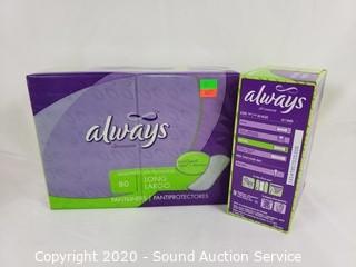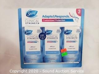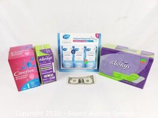 Lot Details: 3pk Secret Clinical Strength Invisible Solid deodorant, 3 boxes of Always Dry Weave long liners and Carefree Acufresh long liners.