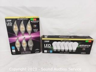 Lot Details: (6) 8.8w, 800 lumen, 2700k standard LED light bulbs & (5) 3.3w, 300 lumen, 2700k chandelier bulbs.