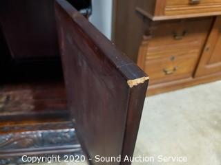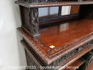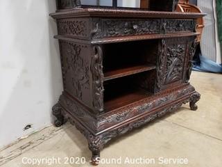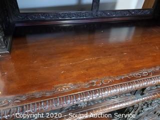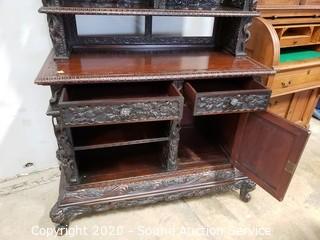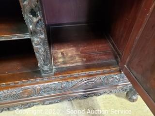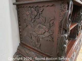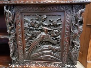 Lot Details: Every inch of this piece is beautifully carved with images of dragons, birds, flowers and much more. 2 pieces, top piece has 5 shelves, lower piece has 2 drawers, cabinet and a single shelf. In great condition, some very minor wear (scuffs, scratches). Overall 75" H x 41.5" x 21".