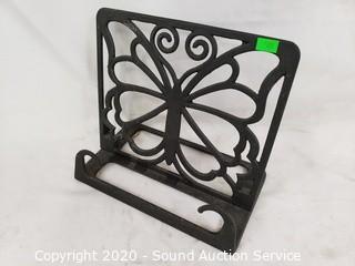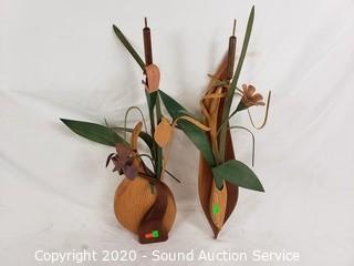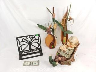 Lot Details: Includes wood flower and vase decor, limited Laaf Collection composite sculpture and cast iron sheet music stand. Flowers are 20" tall, sculpture is 10" tall.