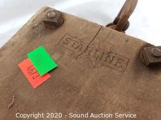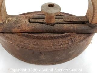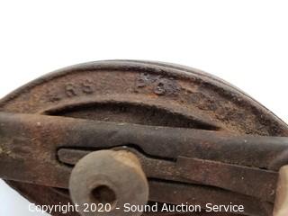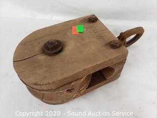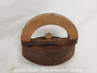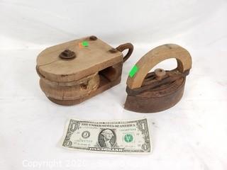 Lot #0316: Vintage Wood Block Pulley & Sad Iron