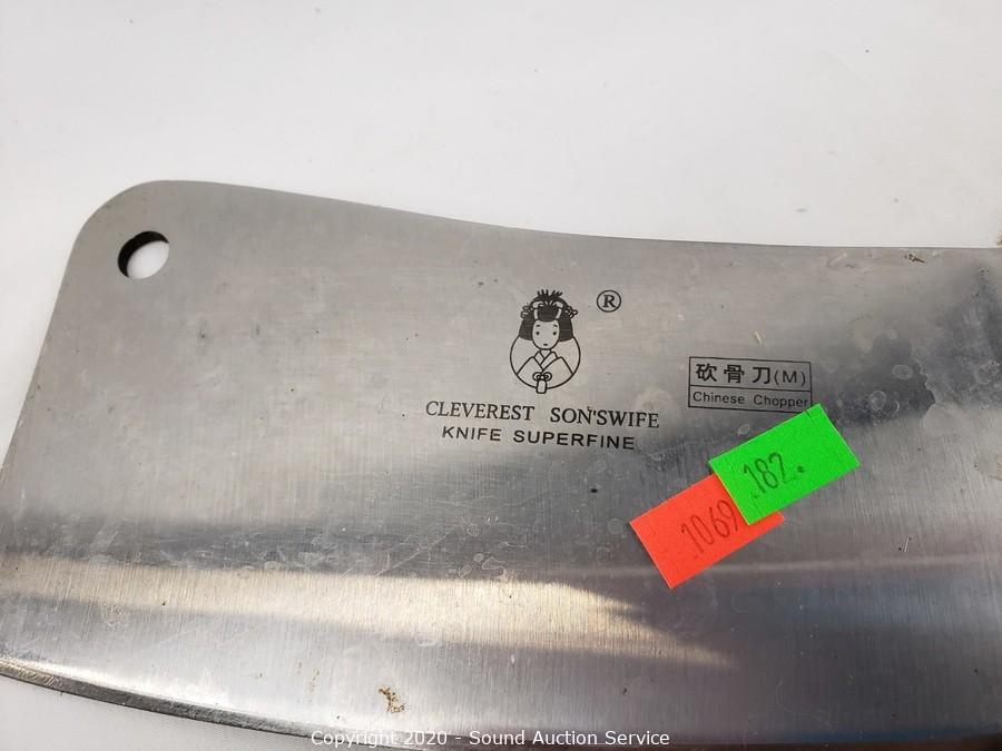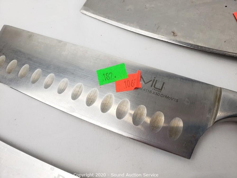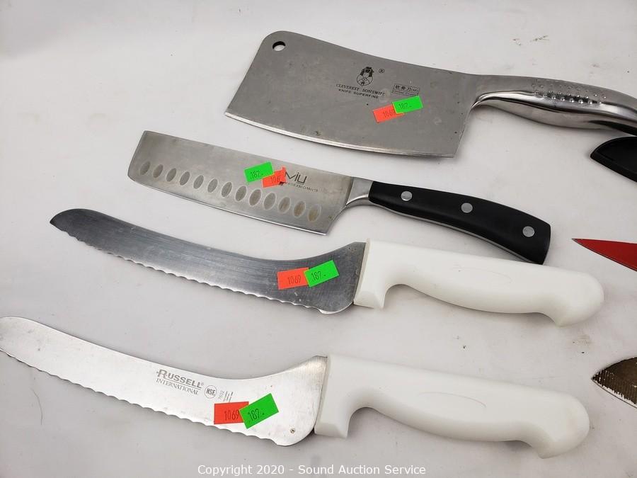 Lot Details: Cuisinart, Miu & Tevolo Chef Knives, Cleverest Chopper Cleaver, Russell Carving Knives. Cookbooks are in an Asian script.