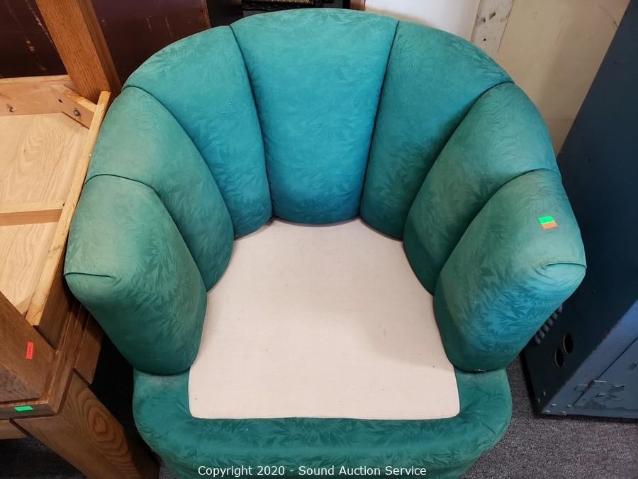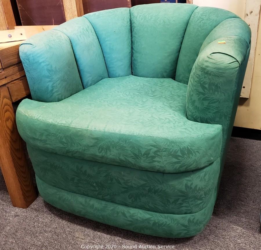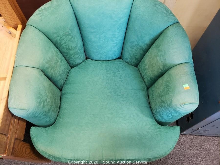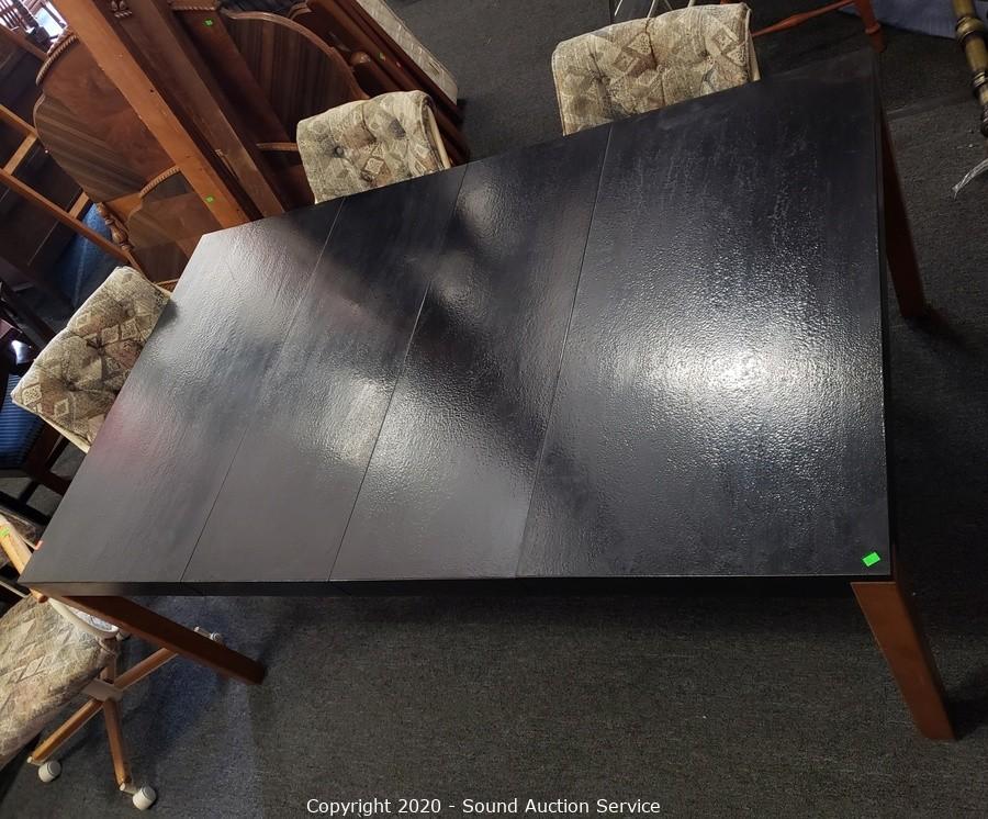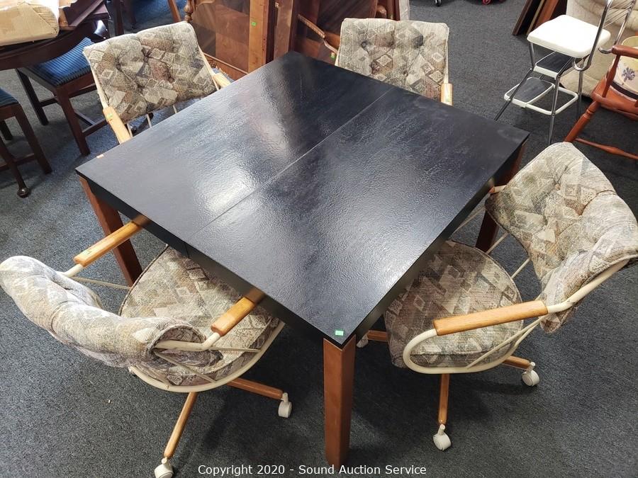 Lot Details: Green Scalloped Back Swivel Easy Chair, has some minor discoloration on the arm rests, otherwise in great condition. 28" x 30", 18" to seat. Black Laminate Dining Table w/4 Rolling Chairs. Chairs are metal frame with fabric cushions and wood arms and legs. All appear to be in good condition, some wear to the finish. Table is 29.5" x 41.5" x 41.5" with (2) 14.5" leaves.
