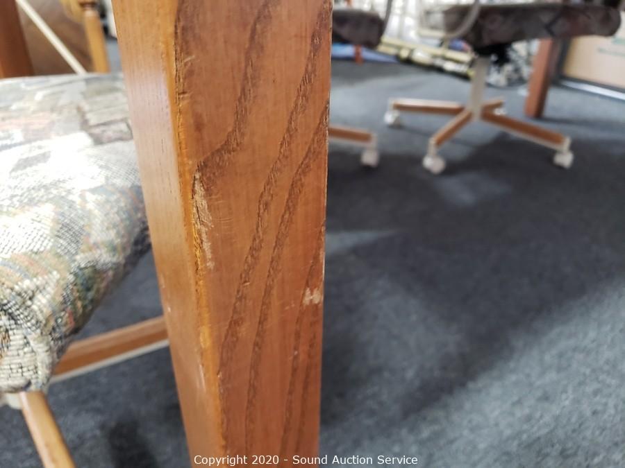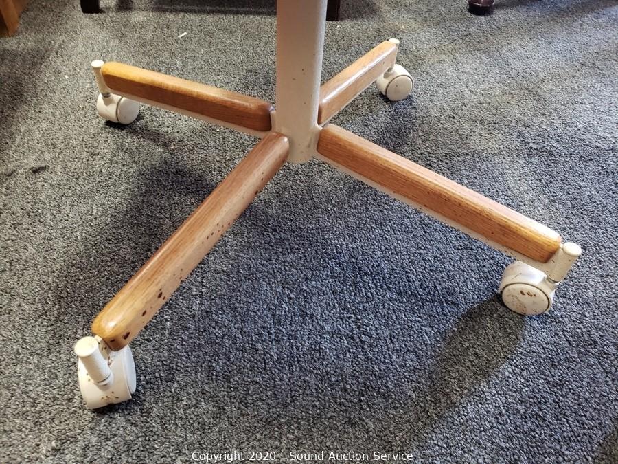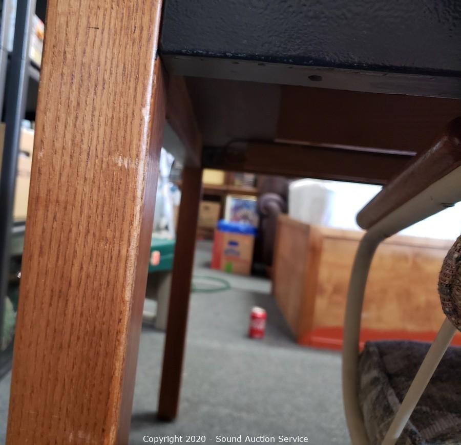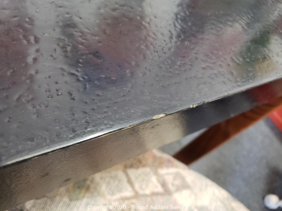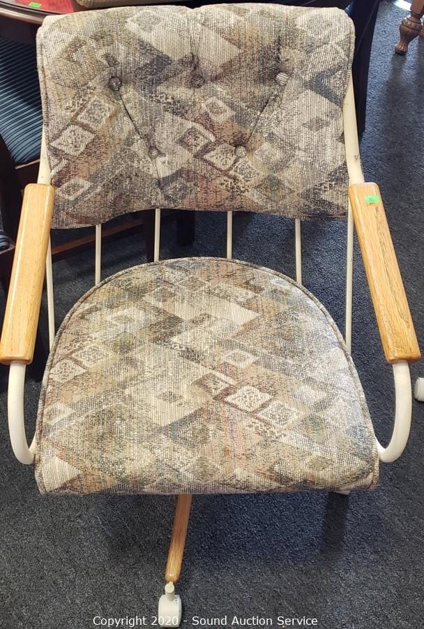 Lot Details: Green Scalloped Back Swivel Easy Chair, has some minor discoloration on the arm rests, otherwise in great condition. 28" x 30", 18" to seat. Black Laminate Dining Table w/4 Rolling Chairs. Chairs are metal frame with fabric cushions and wood arms and legs. All appear to be in good condition, some wear to the finish. Table is 29.5" x 41.5" x 41.5" with (2) 14.5" leaves.