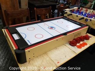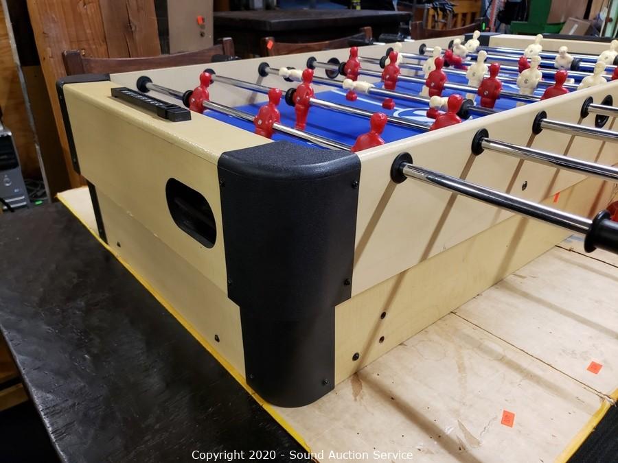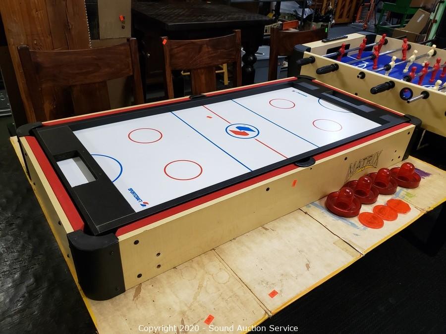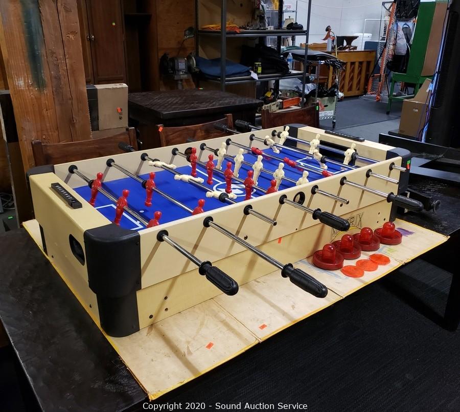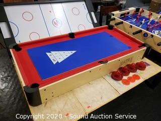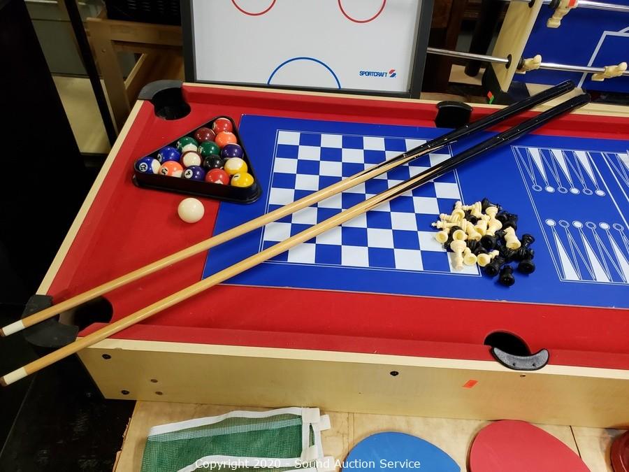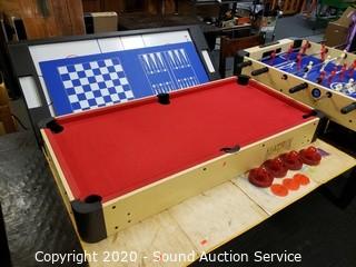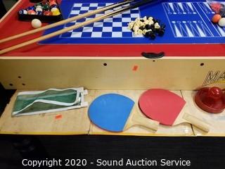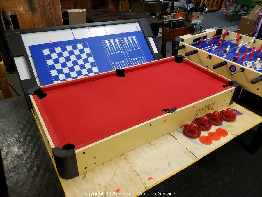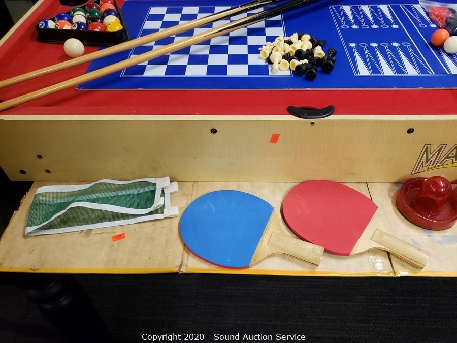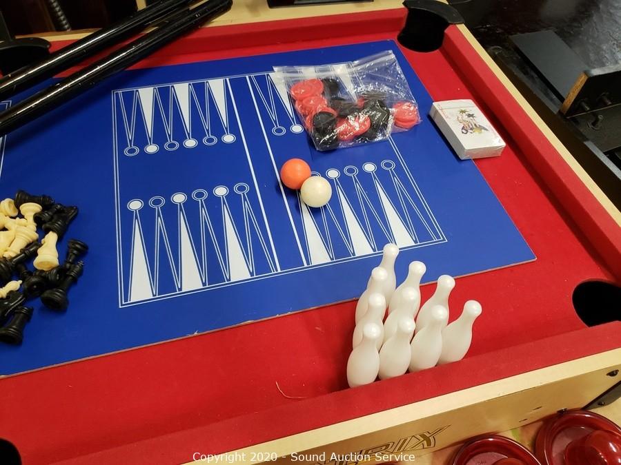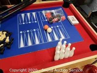 Lot Details: Includes Foos Ball, Air Hockey, Pool, Chess, Checkers, Backgammon, Ping Pong and Shuffleboard. Approx. 36" H x 24" W x 48" L. Missing 2 chess pieces, most pieces appear to be accounted for.