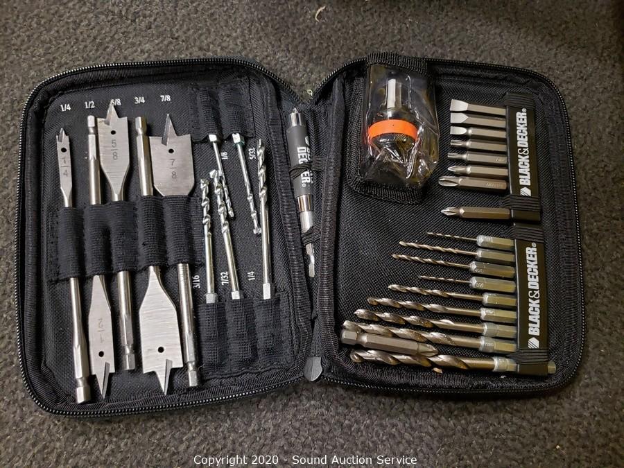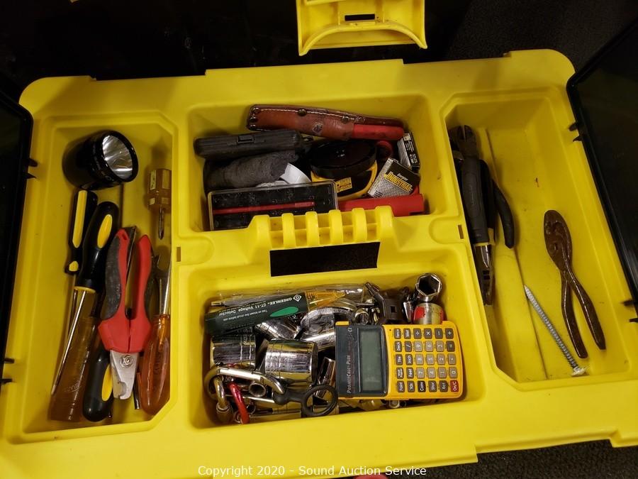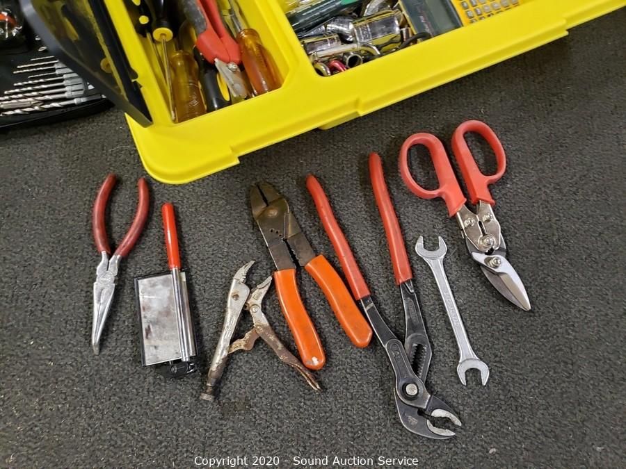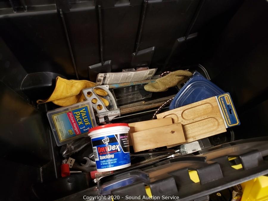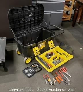 Lot Details: Removable tool tote insert. Includes sockets, tin snips, pliers, bit set, screwdrivers, hack saws, wood finish repair kit, picture hanger kit and more. Tote has a repaired hole in the top. Rolling with handle. 19" x 29" x 18".
