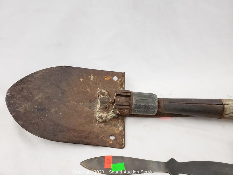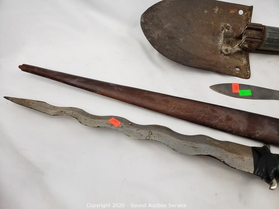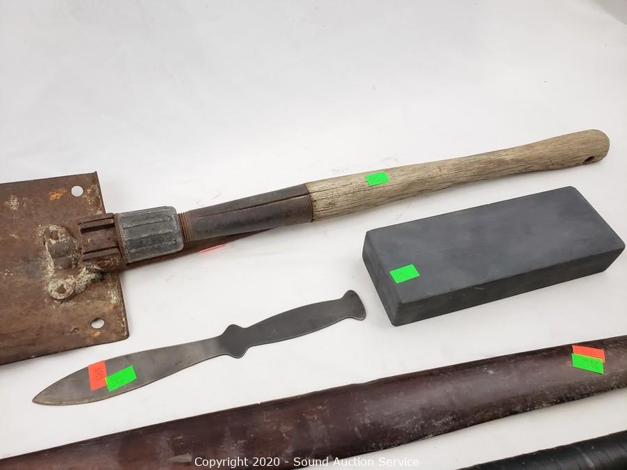 Lot #0201: Throwing Knife, Sharpening Stone, Spear & Shovel
