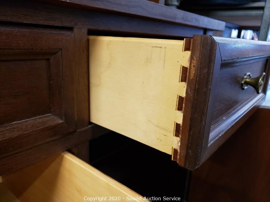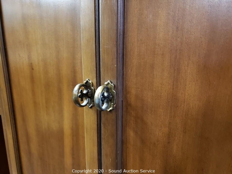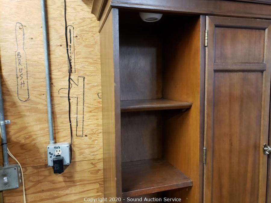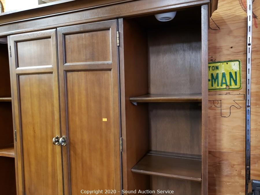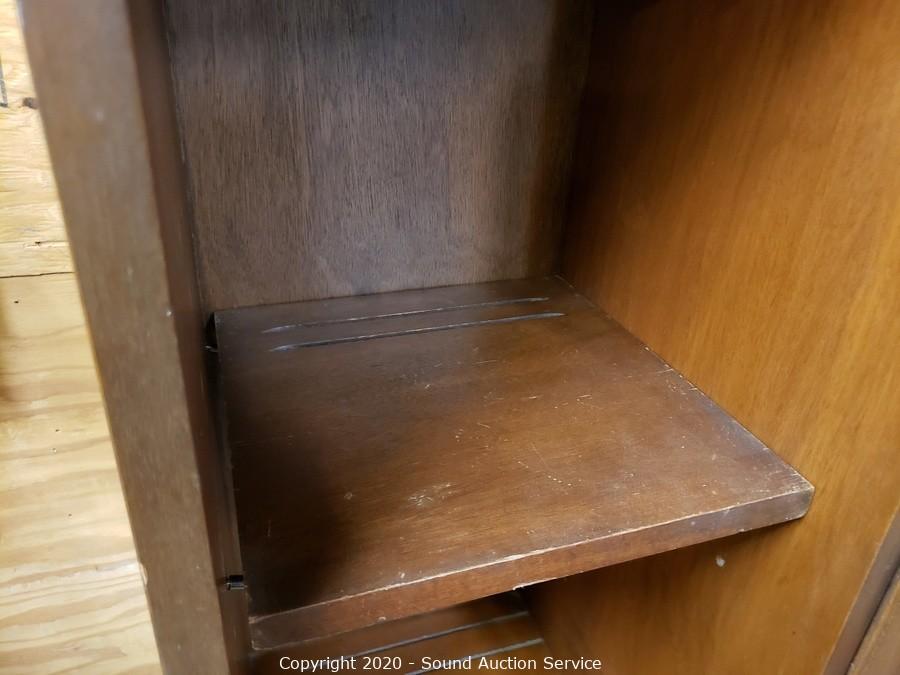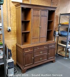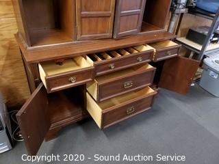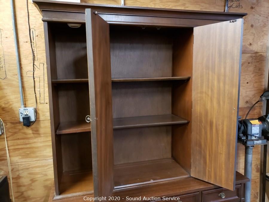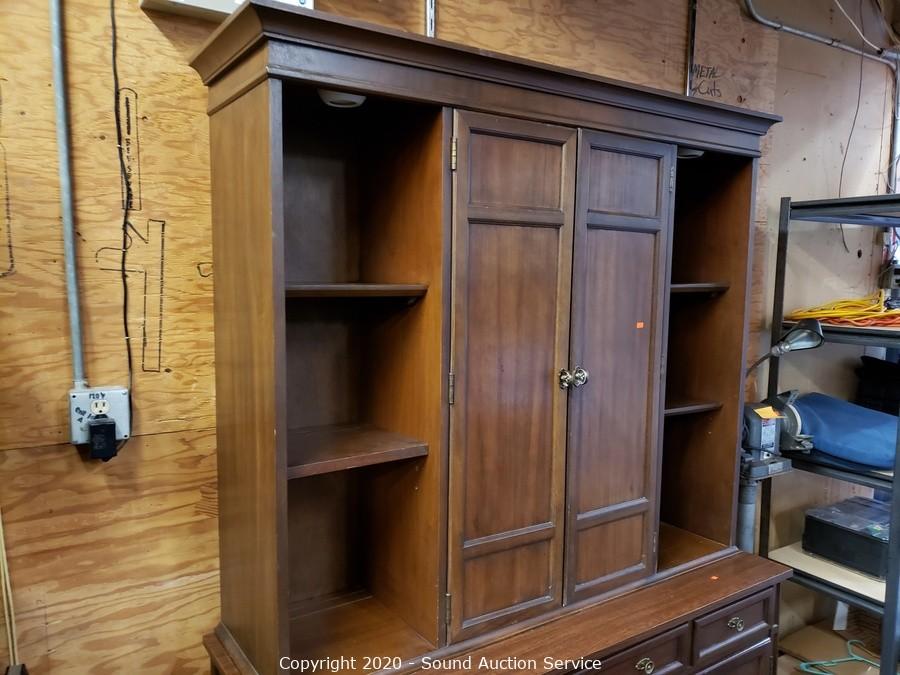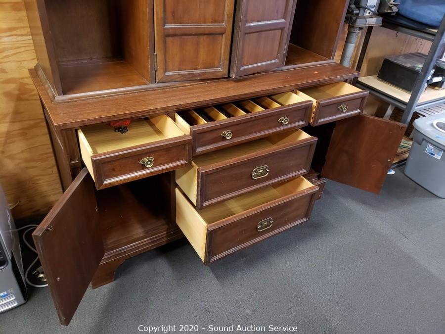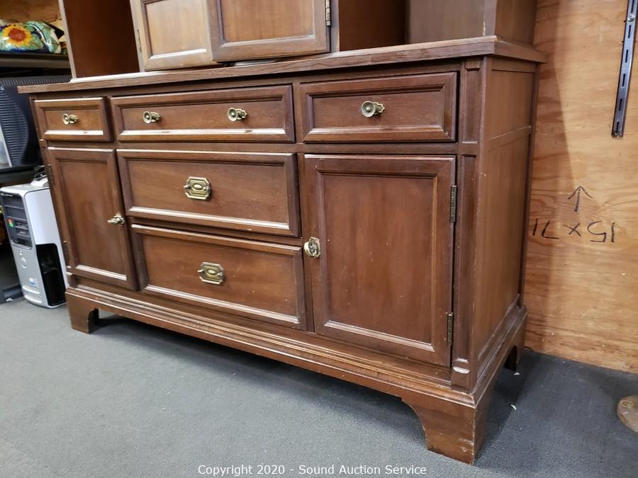 Lot Details: 4 drawers, upper and lower cabinets, one shelf on each side is adjustable, plate grooves, 2-piece. 77" x 54" x 20". Some minor wear, overall good condition.