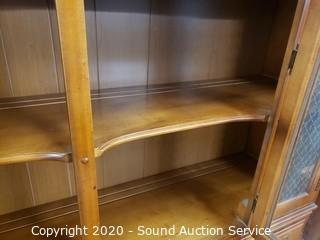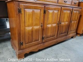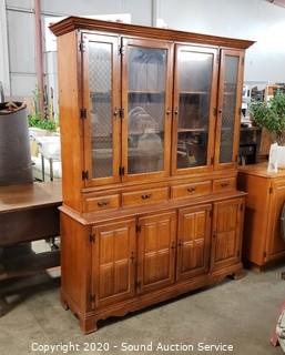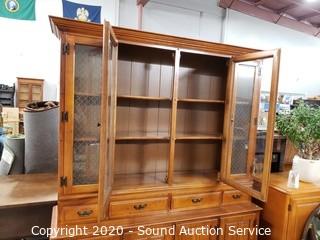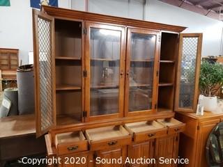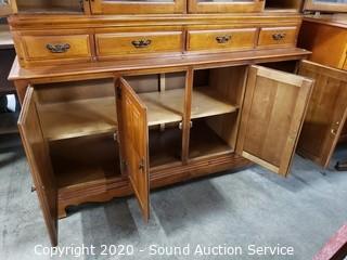 Lot Details: Top portion has 2 shelves, plate grooves, 4 drawers. Lower portion has 3 separate cabinets, left and center cabinets have a single shelf. In overall good condition, some minor wear. Overall 78" H x 60" x 17".