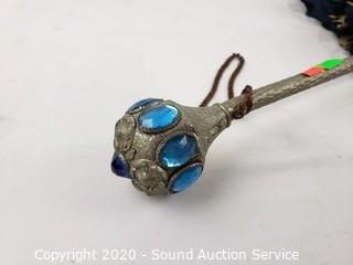 Lot Details: Handle is accented with rhinestones. Works, is a little hard to open. Some rust. 32" x 38" diameter.