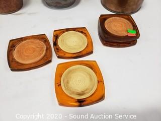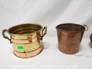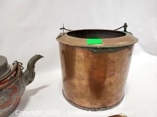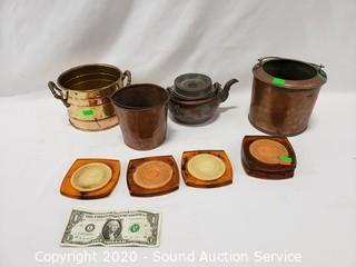 Lot Details:  Teapot is ornately overlaid with a pewter  dragon, pottery on the lid has been repaired.  Comes with 6 coasters, 3 copper planters  (smallest is 4" x 4.5", largest is 6" x 5.5").