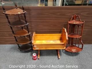 Lot Details: 25" & 33" H x 8" & 9" shelves, bassinet is 19" H x 11" x 20". Various wear to the finish.