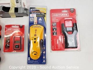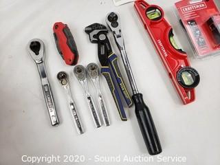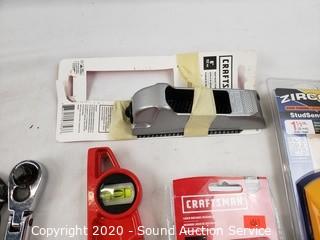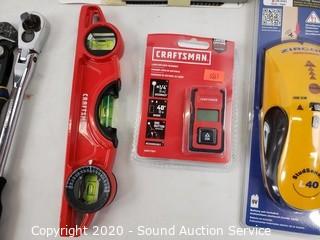 Lot Details: Craftsman & Zircon stud sensors, laser distance measurer, Craftsman torpedo level, folding razor knife, rasp, groove joint pliers, 3 Craftsman 1/4" drive ratchets & 2 Craftsman 3/8" drive ratchets.