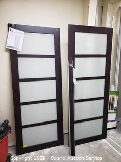 Lot Details: Each door is 31" x 78-3/4", with frosted glass panels. Comes with hardware & manual. Appears to be complete, minor fade spot to the finish of one otherwise don't see any issues.