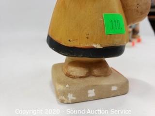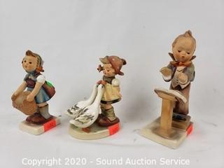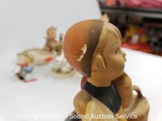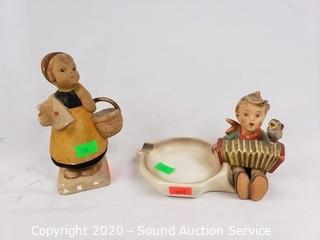 Lot Details: TMK-3 Goose Girl #473, TMK-2 #114 Let's Sing Ashtray, TMK - 3 #129 Band Leader, WWII Chalk USA Hummel (some chips), TMK-3 #73 Little Helper, TMK-3 #94 3/0 Hansel & Gretel & 3 ornaments. 2" to 5" tall.