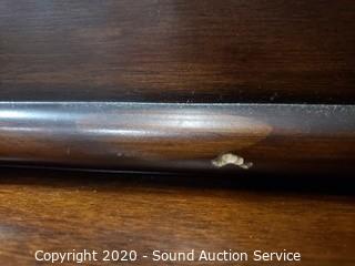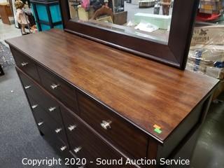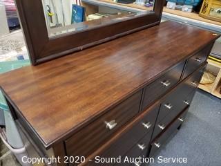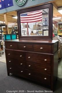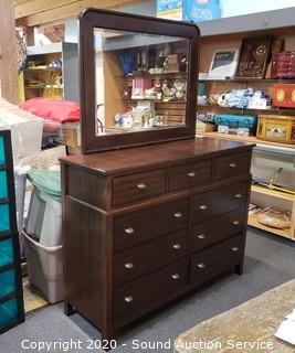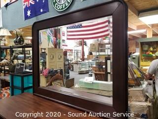 Lot Details: Dark finish, beveled mirror topper, has a couple small scuffs and scratches, otherwise in excellent condition. 42" x 56" x 18" with 33.5" x 43" mirror topper.