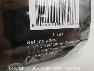 Lot Details: Each set includes 10 shelf shoe organizer, 6 shelf sweater organizer and 1 under-bed bag.