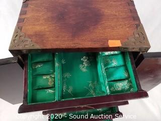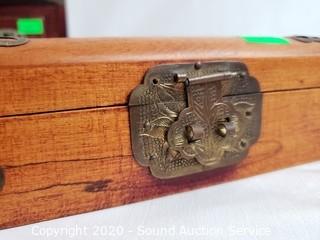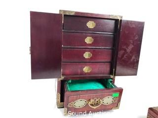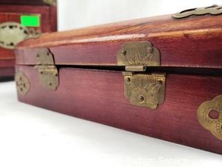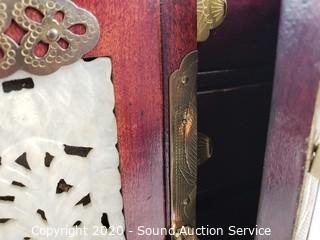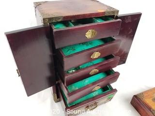 Lot Details: Both have locks, comes with one key. Beautiful white jade inlay, tin wrapped. Larger one has 5 drawers, one of the holes for the lock's weld has come free. Smaller one has a broken hinge. 2" x 6.5" x 4" and 12.5" x 6" x 8".