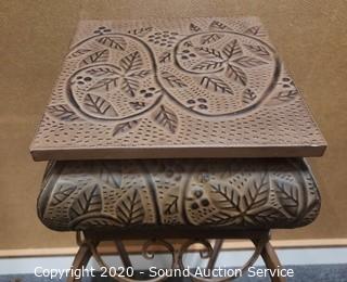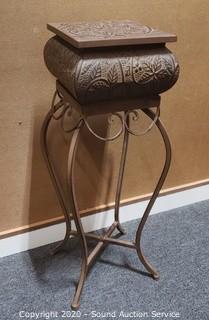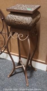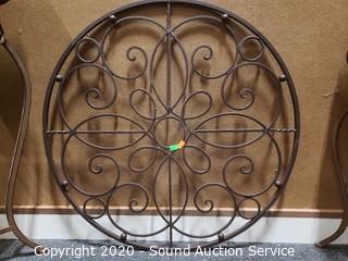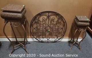 Lot Details: Round Wall decor, 2 plant stand / planters top of plant stands remove to be pots. 22" H x 6.5" & 29" H x 9"and 24.5" dia wall decor,