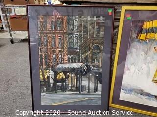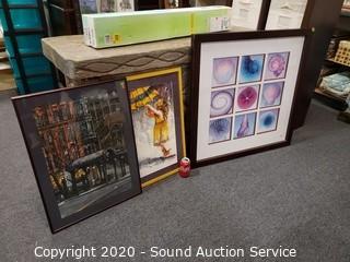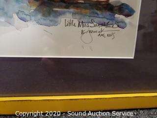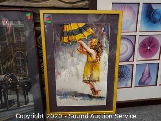 Lot Details: Includes "Little Miss Sunshine" watercolor art by artist B. Aozwrak? 27.5" x 19", street artwork (refer to photos for signature) 28" x 20.5" and colorful sea shell collage 35" x 35". All are framed and matted, with glass.