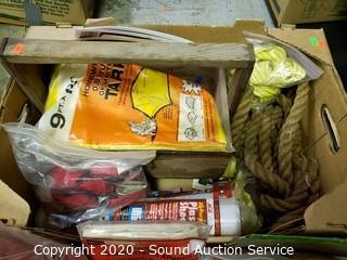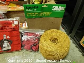 Lot Details: Includes tie downs, plastic sheeting, clothes pins, paint chipper, Beware of Dog signs, 9x12ft tarp, ball of twine, carpenters apron, wood tool tray and shop towels.