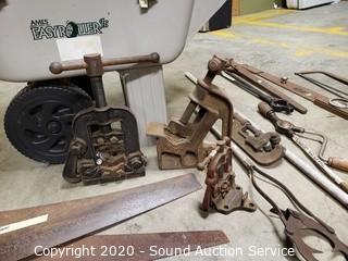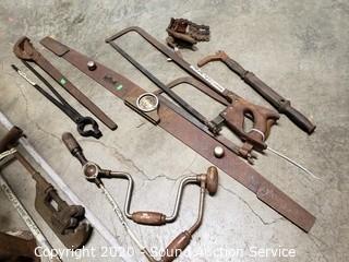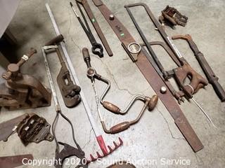 Lot Details: Meat saw, clamps, quarter angle brace drill, cross cut saws, wrenches, pipe clamp and more. Wheelbarrow is 22" x 37" x 12".