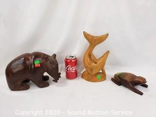 Lot Details: Humpback whale, bear with salmon and dog trinket box. 2" to 10" tall, 6" to 10" long.
