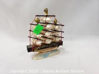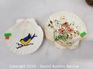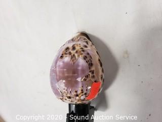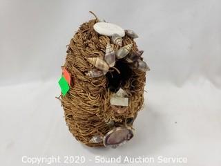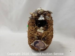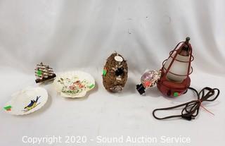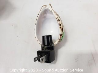 Lot Details: Includes buoy lamp, shell ship sculpture, sea shell night light, rope and shell bird nest and 2 hand painted sea shells. Lamp works, 8" tall.