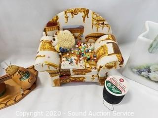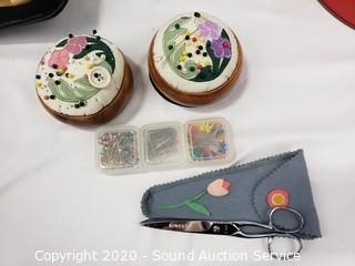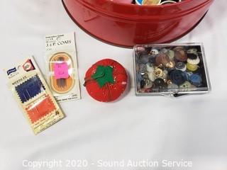 Lot Details: Includes needles, thread, buttons, pin cushions and more.