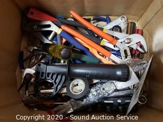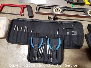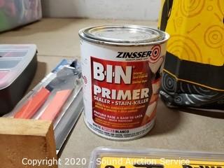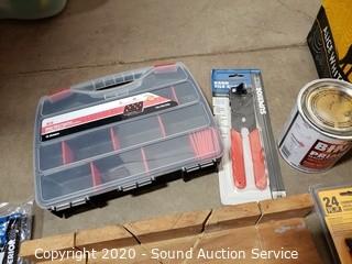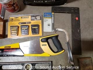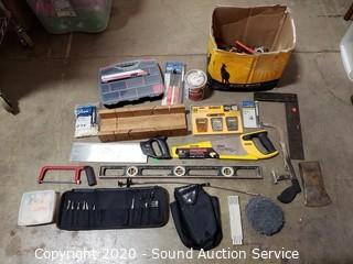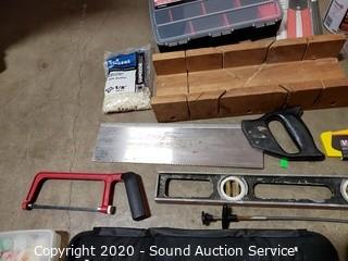 Lot Details: Bits, organizer, miter saw box, 24" level, hand saws, primer, hand tile cutter & more.