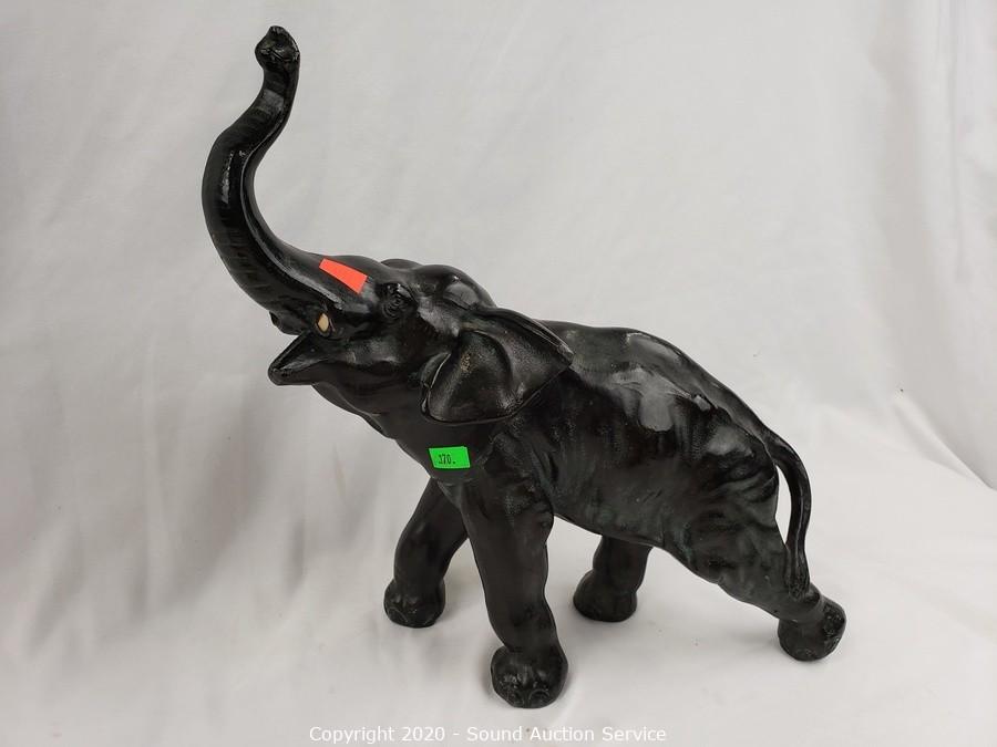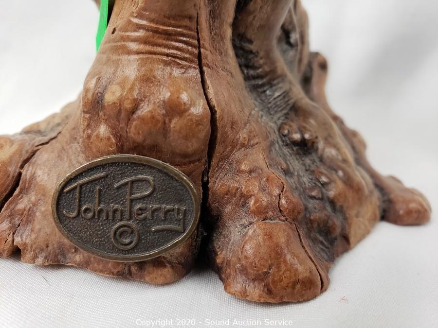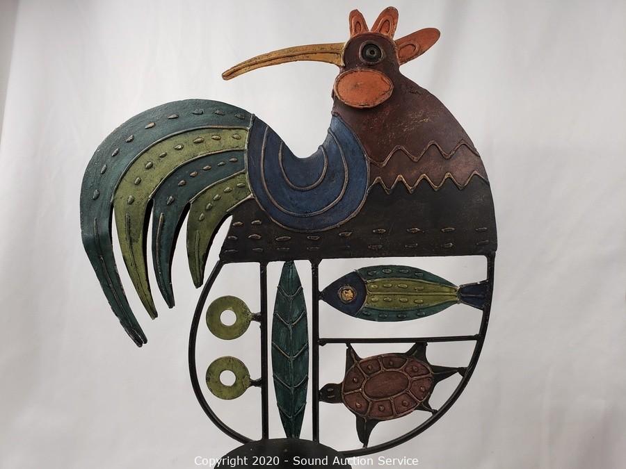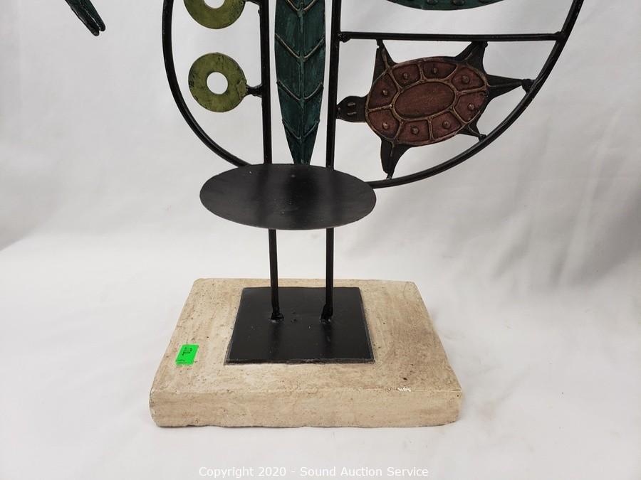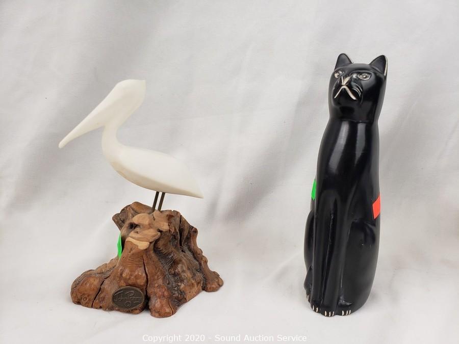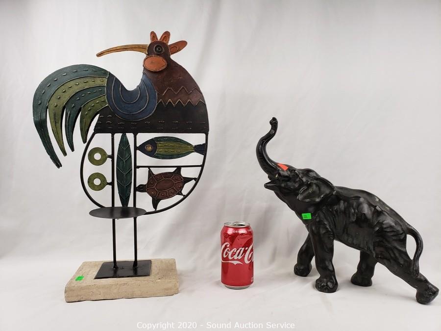 Lot Details: Includes cast metal elephant (missing the tusks) 13" x 13", very heavy, metal art rooster candle holder 20" x 13", carved stone cat 7" tall and John Perry pelican sculpture with burl base 6" tall.