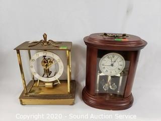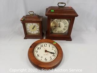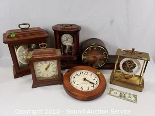Lot Details: None are working. Includes Linden quartz anniversary clock, Seth Thomas electric, Seth Thomas quartz wall clock, Kieninger & Obergfell quartz mantle clock (missing parts, some parts not attached), Westminster chime quartz mantle clock (corroded battery compartment), Seiko Chime wind up mantle clock (no pendulum, no key, no hands).