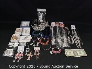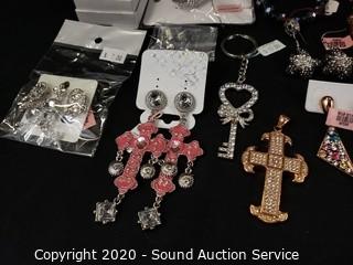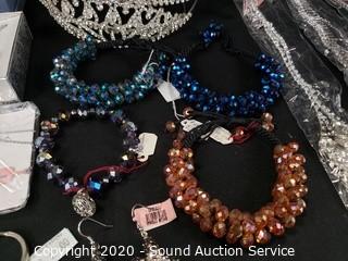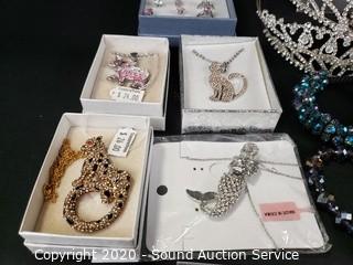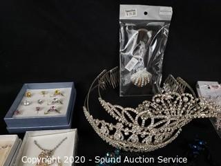 Lot Details: Includes ring and earring sets, necklaces with pendants, bracelets, layered necklaces, tiaras and key chain.