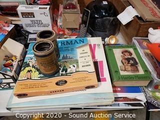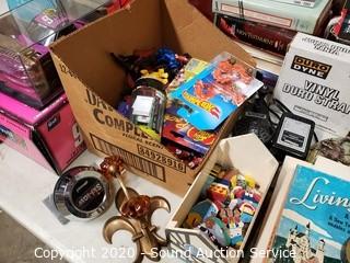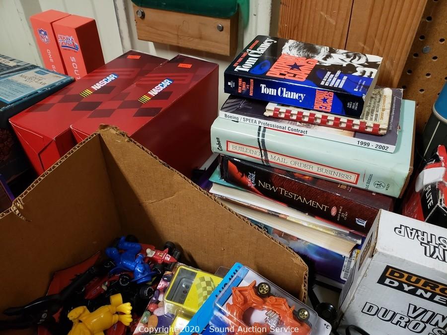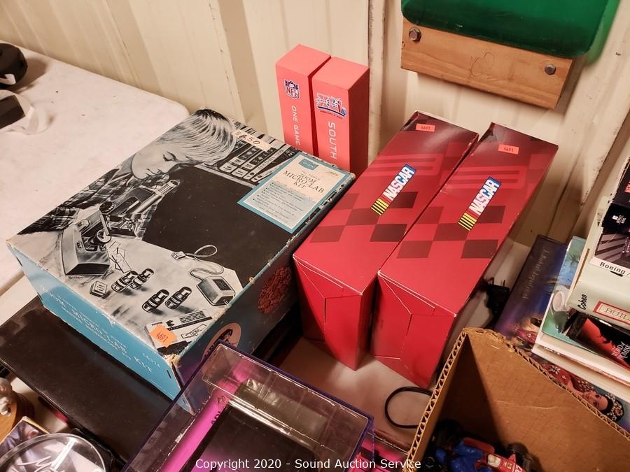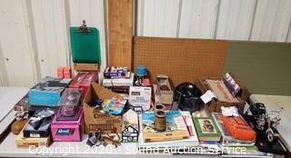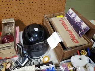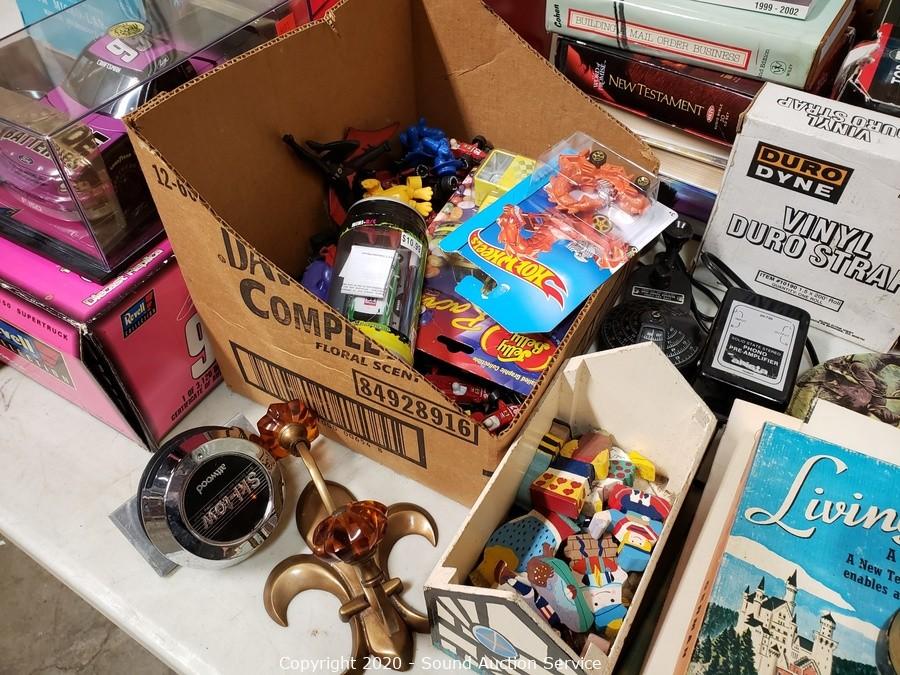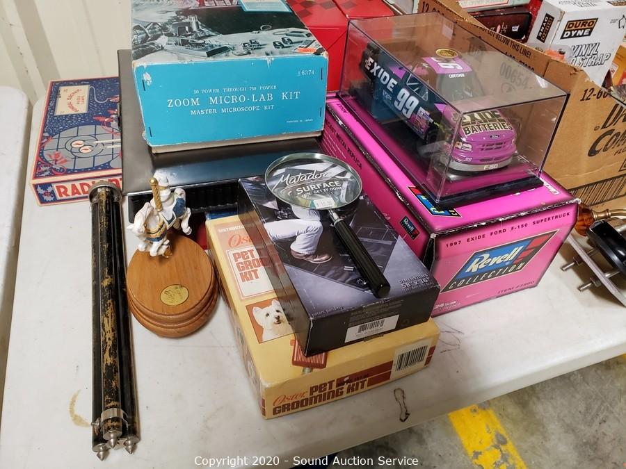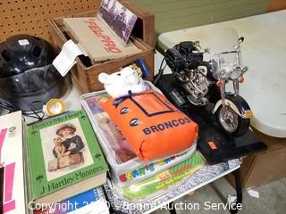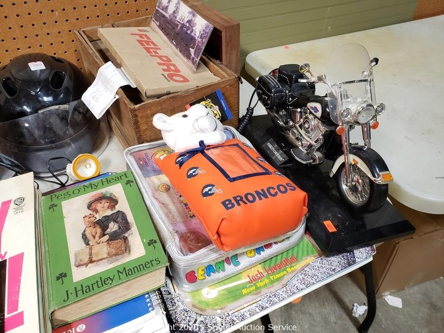 Lot Details: Include die cast replica cars, gas pump ornaments, kerosene lamp, golf balls, Harley Davidson motorbike telephone, pet grooming kit, cordless phone, books and more.